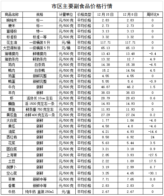 12月15日,监测漳州市31种主要农副产品价格,较上周(12月8日)比,11涨8降12平,其中,冬季猪肉市场,终端消费较前期略有回暖,整体的猪肉价格小幅上涨2.18%;叶类蔬菜供应量增加,整体的蔬菜价格小幅下降2.71%;受商超促销活动影响,监测的2种禽肉价格小幅下降1.14%。其它副食品价格稳定。(漳州市发改委)